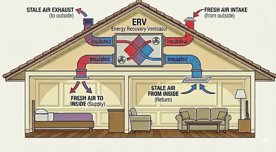 An ERV continuously replaces stale indoor air with fresh outdoor air while recovering energy from the exhaust stream. This reduces CO2 buildup, allergens, and household odors while minimizing humidity and energy impact — improving air quality without significantly increasing energy costs.